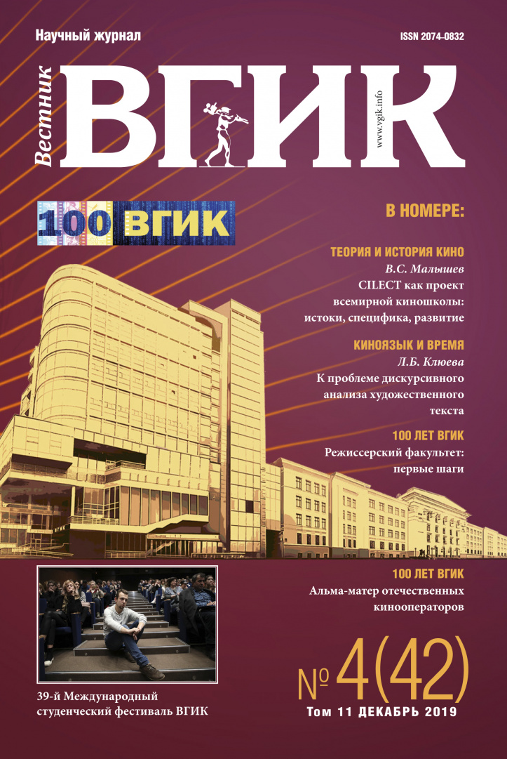 BASIC HEADINGS FILM LANGUAGE AND TIME | IMAGE GENESIS; PERFORMANCE | ART OF PERSONIFICATION; SCREEN CULTURE | CULTURAL STUDIES. PHILOSOPHY; WORLD FULMMAKING | ANALYSIS; PERSONIFICATION IN FOREIGN FILM | CREATIVE PORTRAIT; FILM BUSINESS | MANAGEMENT STRATEGY AND TACTICS; TELEVISION | DIGITAL MEDIA; SCIENCE LABORATORY | YOUNG SCIENTISTS’ RESEARCH; CHRONICLE IN DETAIL | CURRENT EVENTS; READING-ROOM | REVIEW; READING-ROOM | BOOK SHELF; SUMMARY | AUTHORS PRESENTATION