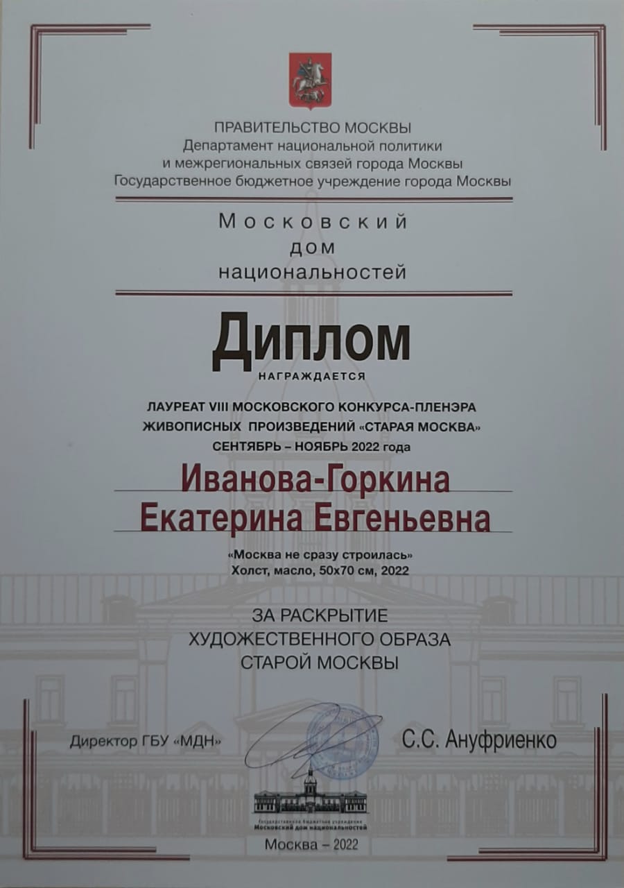 Поздравляем преподавателя колледжа Екатерину Евгеньевну Иванову-Горкину, ставшую лауреатом VIII Московского конкурса-пленэра «Старая Москва». Желаем дальнейших творческих побед и высоких достижений!