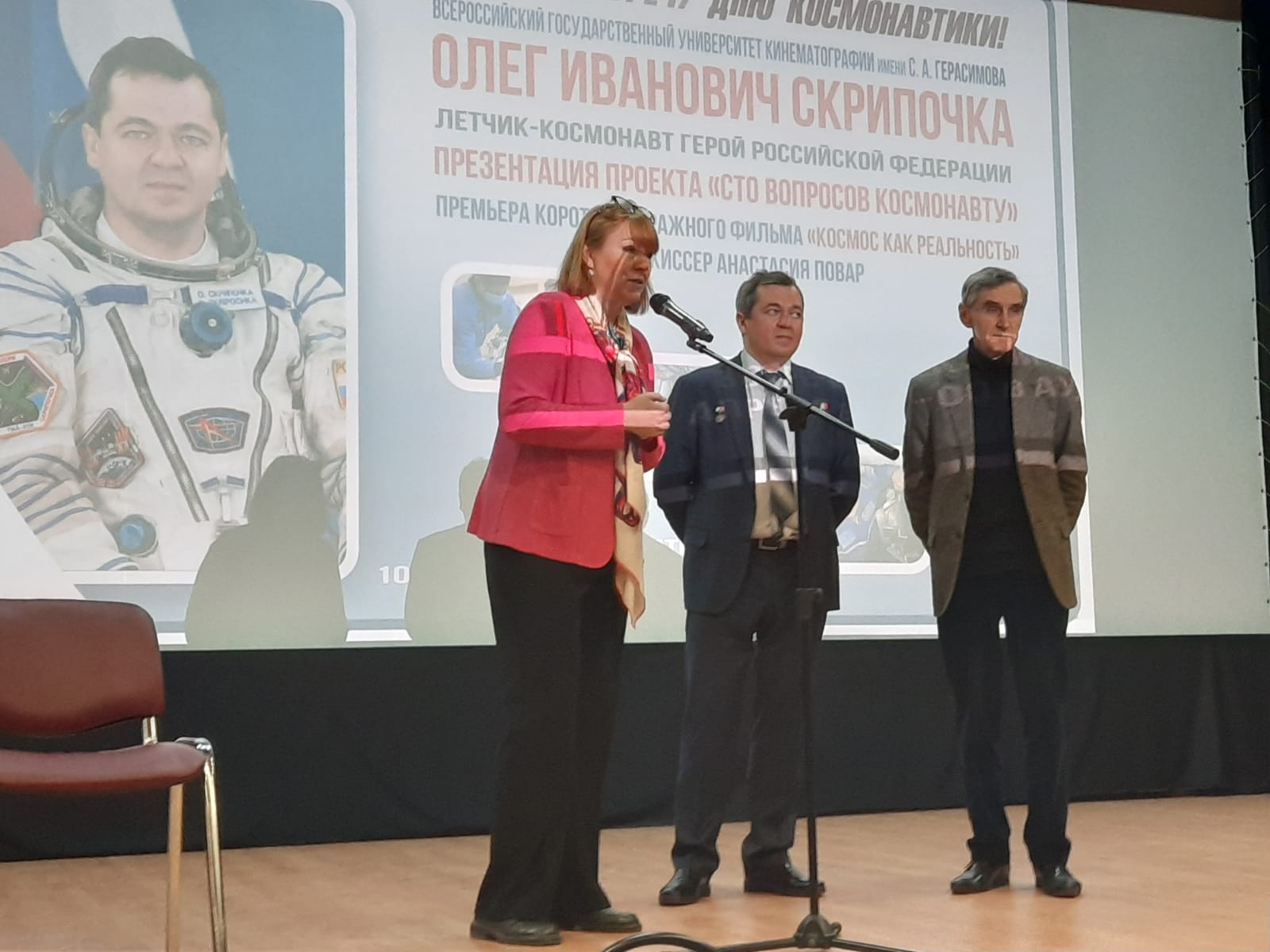 Открыли встречу Е. Г. Ярёменко, декан факультета анимации и мультимедиа, и С. М. Соколов, завкафедрой анимации и компьютерной графики. Они сообщили о творческом сотрудничестве Университета ВГИК с героями- космонавтами и новых проектах, одним из которых является цикл фильмов под общим названием «100 вопросов космонавту».