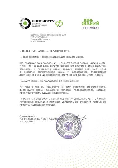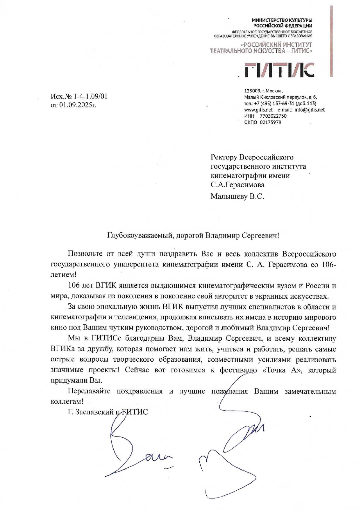 Ректора ВГИКа В.С. Малышева поздравляют с Днём знаний!