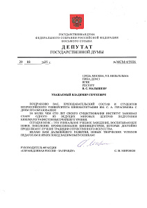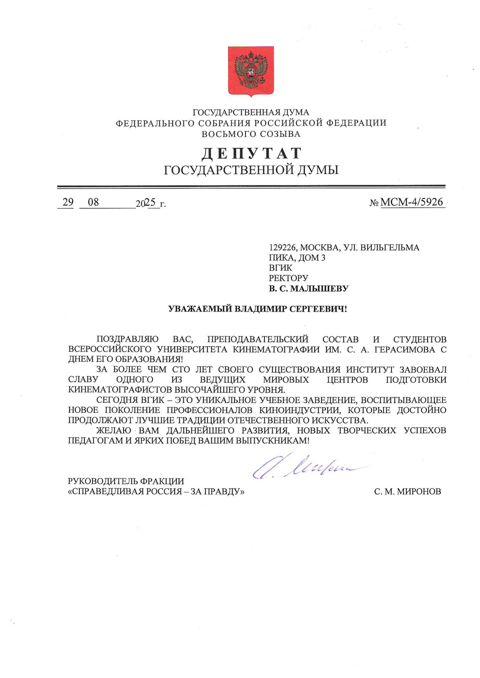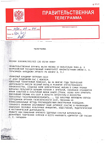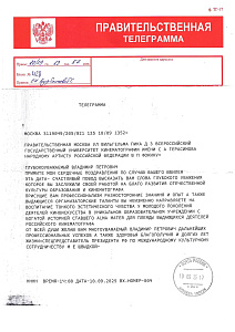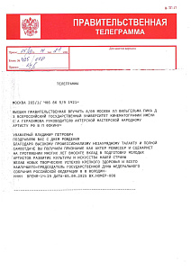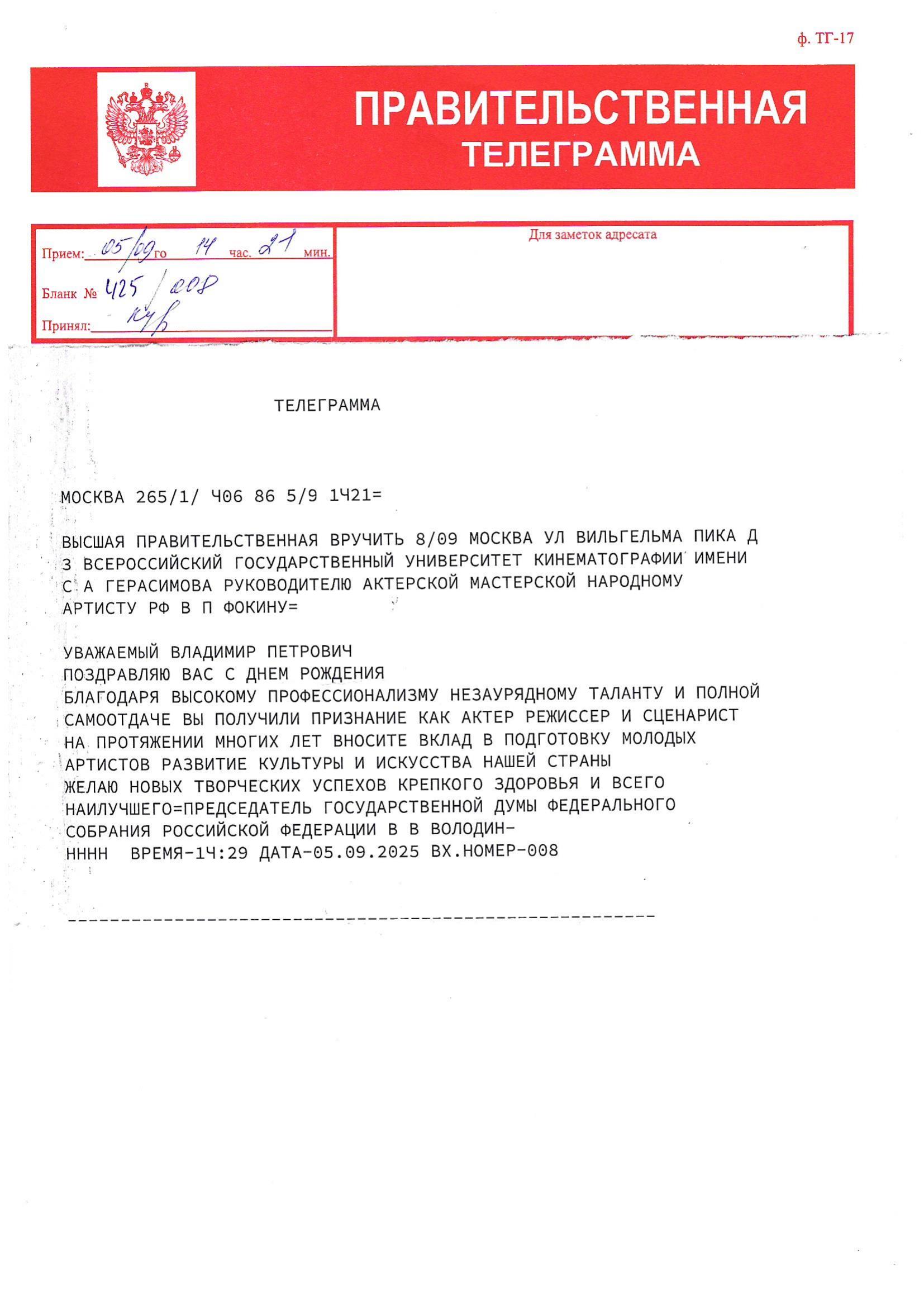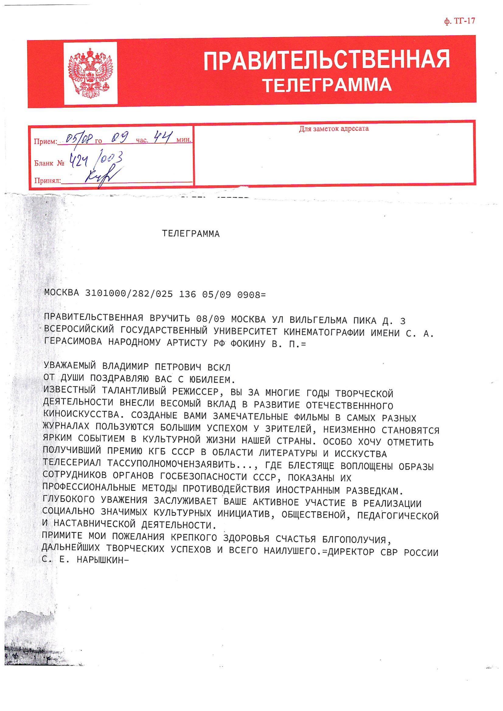 В адрес Народного артиста РФ, Заслуженного деятеля искусств РФ, режиссёра, заведующего кафедрой актерского мастерства ВГИКа В.П. Фокина приходят поздравительные телеграммы с юбилеем!
