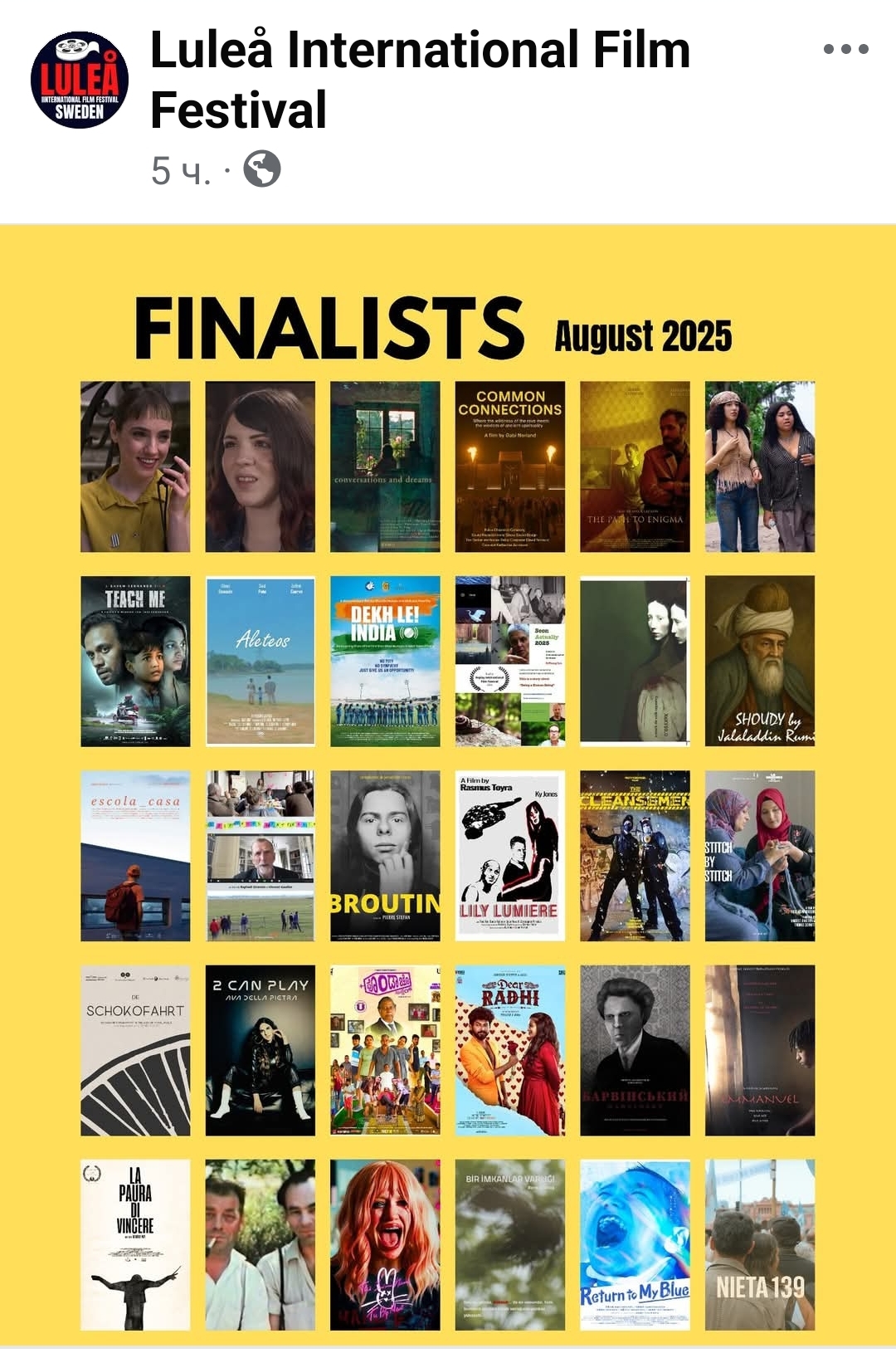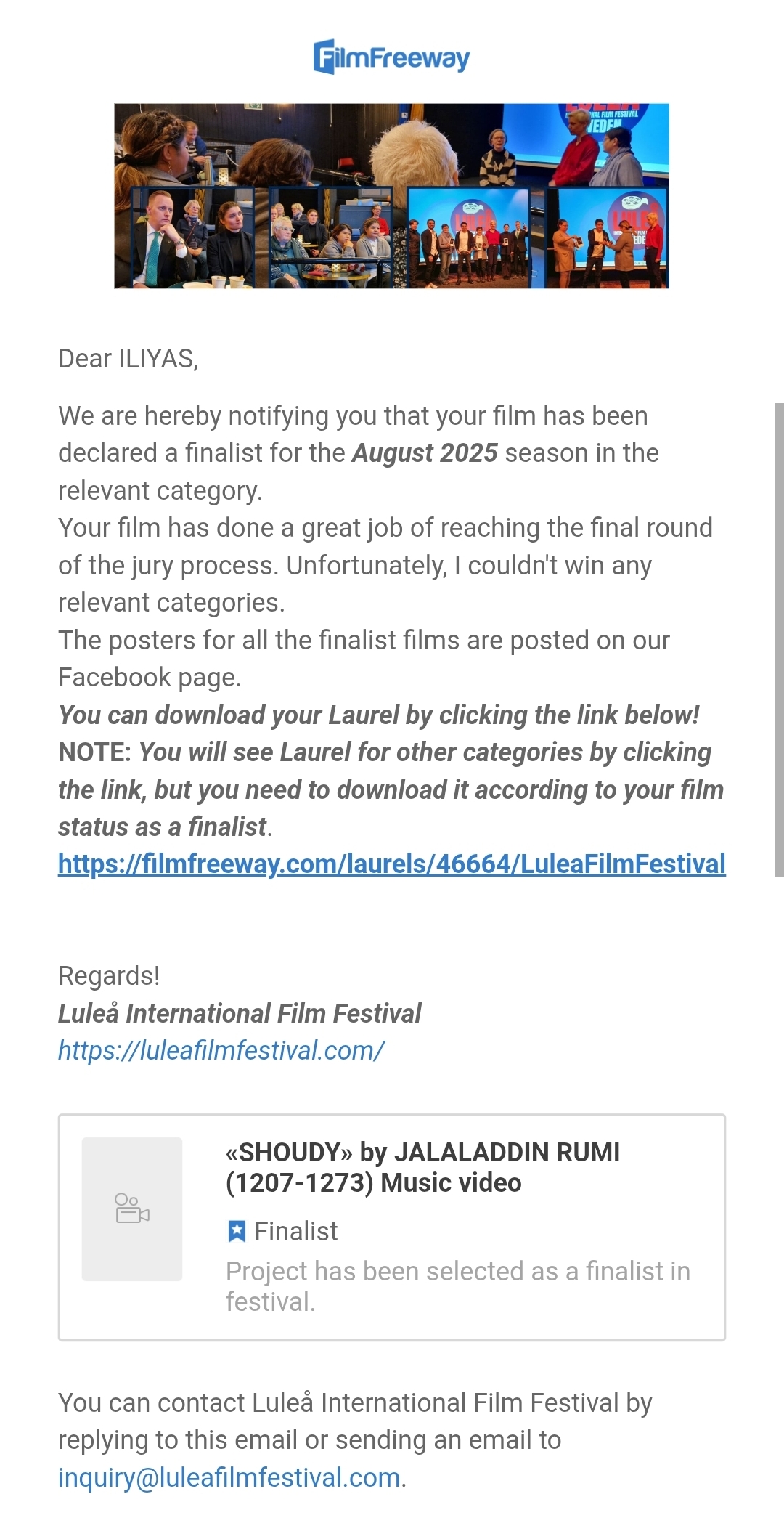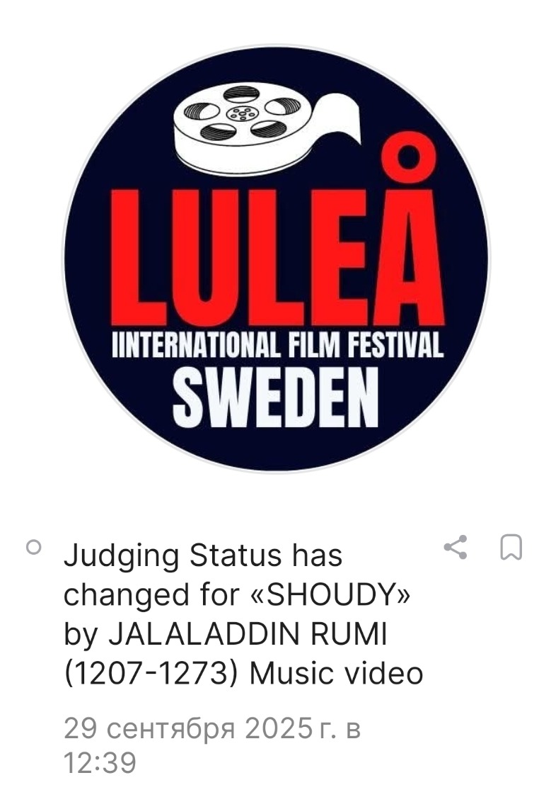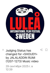 Лулео, Швеция 29.09.2025/ Международный кинофестиваль «Lulea International Film Festival» LIFF-2025 — в городе-порте на северо-востоке Швеции, в фьорде Ботнического залива Балтийского моря определил круг победителей. Музыкальное видео «SHOUDY by JALALADDIN RUMI (1207-1273)» 2025 — с участием дуэта студентов актёрского факультета, Мастерская Фархада Махмудова — Ёсуман Исмаиловой и Шахриёра Гулмахмадзада — https://filmfreeway.com/projects/3826312 вошедшее в «Трилогию «ПОСВЯЩЕНИЕ Джалаладдину Руми (1207-1273)» — https://filmfreeway.com/projects/3826129 на ряду с проектами «OSHIQONAKHO» by JALALADDIN RUMI (1207-1273) — https://filmfreeway.com/projects/3826582 и «NAI NOUMIE» by JALALADDIN RUMI (1207-1273) — https://filmfreeway.com/projects/3826277снятые режиссёром Ильясом Дауди, магистрантом ВГИК им. С.А. Герасимова — стало Финалистом конкурса, заняв второе место в номинации «Лучшее Музыкальное видео»