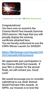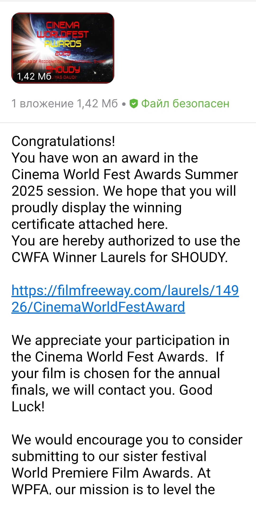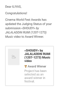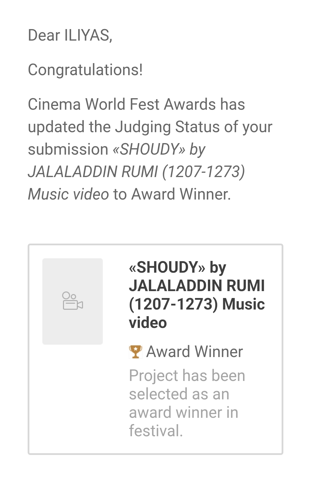 Лос-Анджелес, Калифорния, США 30.09.2025 — Международный кинофестиваль «Cinema WorldFest Film Awards» подвёл итоги. Музыкальное видео «SHOUDY by JALALADDIN RUMI (1207-1273)» https://filmfreeway.com/projects/3826312 с участием студентов актёрского факультета, мастерская Фархада Махмудова — Ёсуман Исмаиловой и Шахриёра Гулмахмадзада, входящее в «Трилогию «ПОСВЯЩЕНИЕ Джалаладдину Руми (1207-1273)» (eng. «DEDICATION» to JALALADDIN RUMI (1207-1273) trilogy Music video),пополнило список трофеев — Первым местом в номинации.