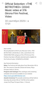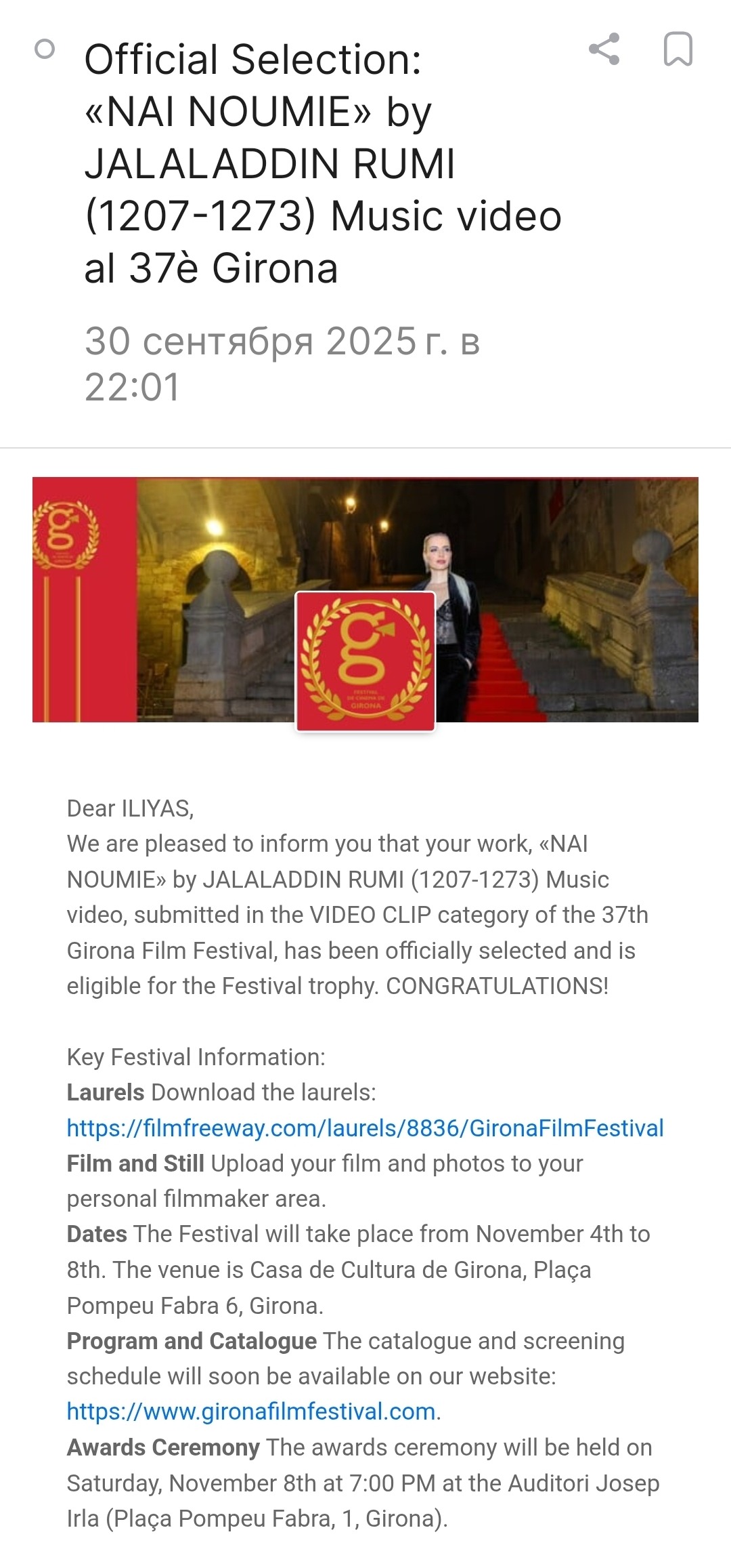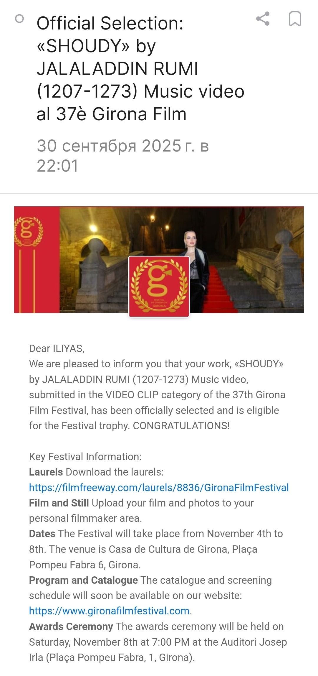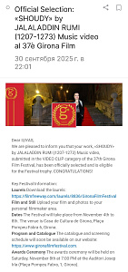 Жирона, Каталония, Испания — 1 октября 2025 года/ С 4 по 8 ноября 2025 года в центре столицы района Жироны, Испания проводится ежегодный Международный кинофестиваль «37th FESTIVAL DE CINEMA DE GIRONA» GIFF-2025. Накануне, организаторы «GIFF-2025» сообщили в Москву хорошую новость — Четыре проекта студентов ВГИК им. С.А. Герасимова: «SULTONI QALBAM», «THE BETROTHED», «SHOUDY», «NAI NOUMIE» из Трилогии «Посвящение Джалаладдину Руми (1207-1273)» — прошли официальные отбор и примут участие в номинации «Лучшее музыкальное видео». Продюсер и режиссёр проектов Ильяс Дауди, магистрант ВГИК им.С.А. Герасимова.