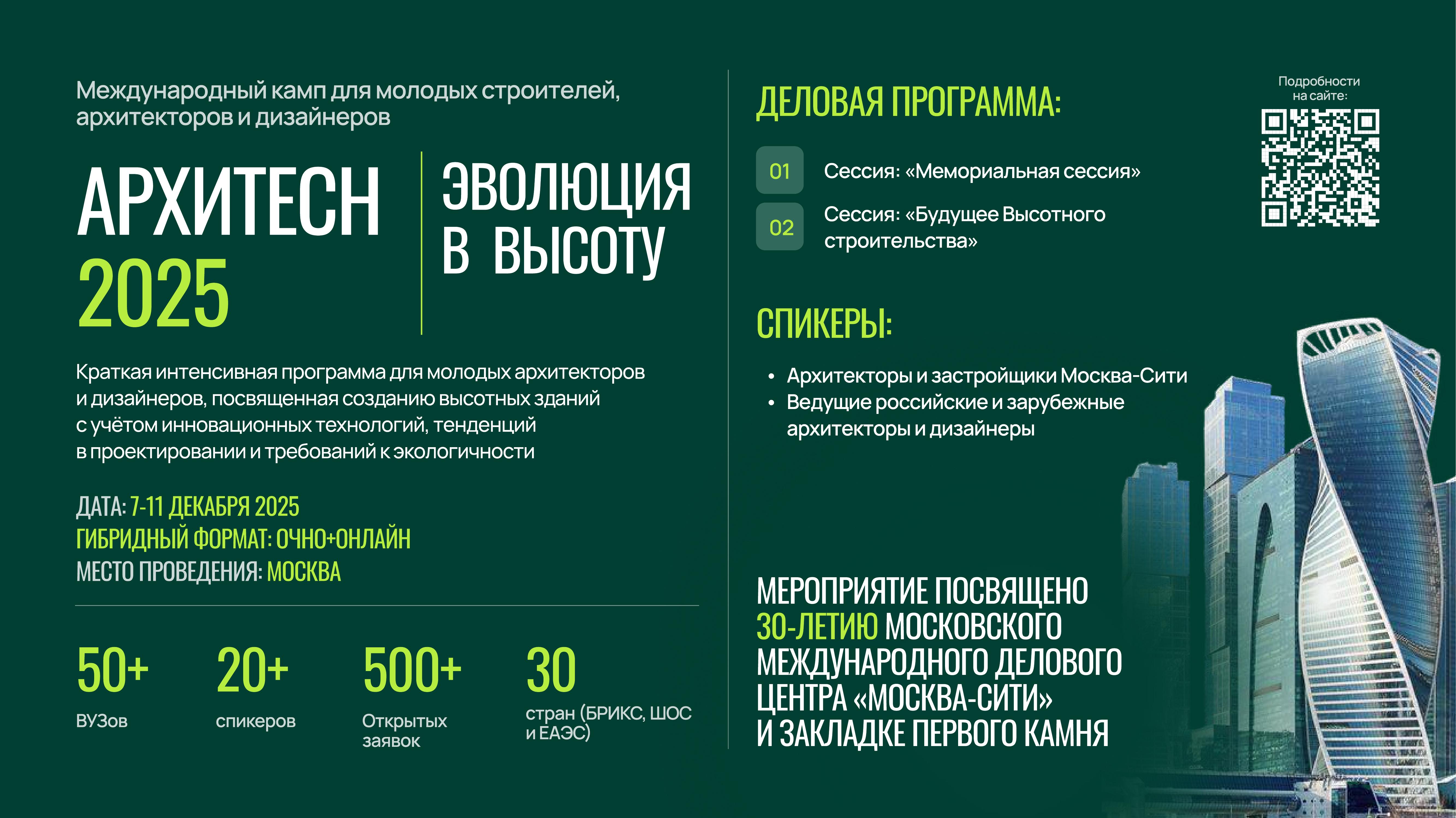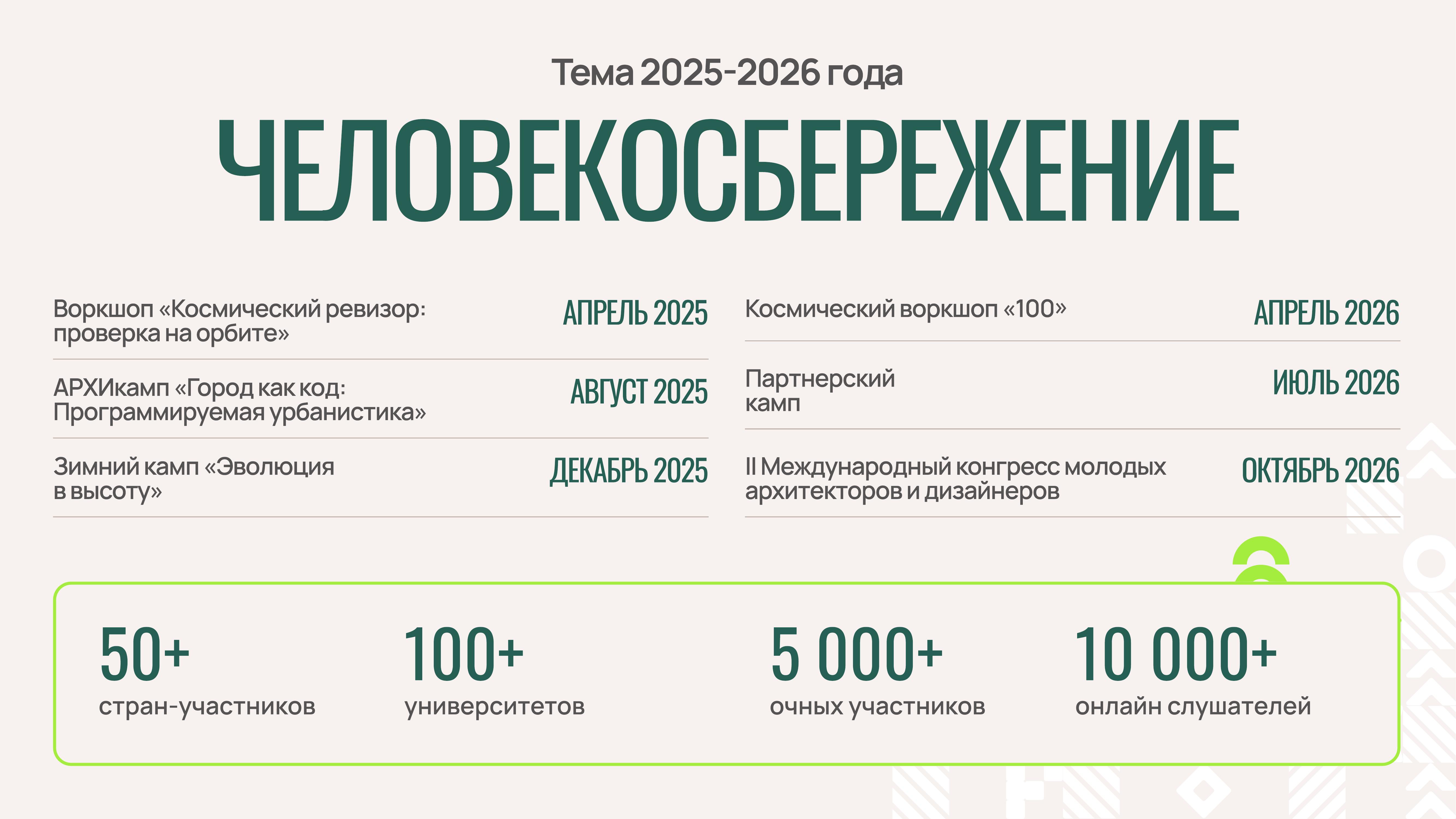 Ближайшее мероприятие Конгресса - Международный молодёжный камп «Эволюция в высоту», который пройдет в Москве, а также онлайн, с 7 по 11 декабря 2025 года. Камп «Эволюция в высоту» — это интенсивная образовательная программа, сфокусированная на создании безопасных, экологичных и комфортных для человека высотных пространств. В мероприятии примут участие более 40 университетов из стран БРИКС+ и РФ, в качестве экспертов мы привлекаем ведущих экспертов отрасли в данной тематике. Основные направления работы проектных групп: