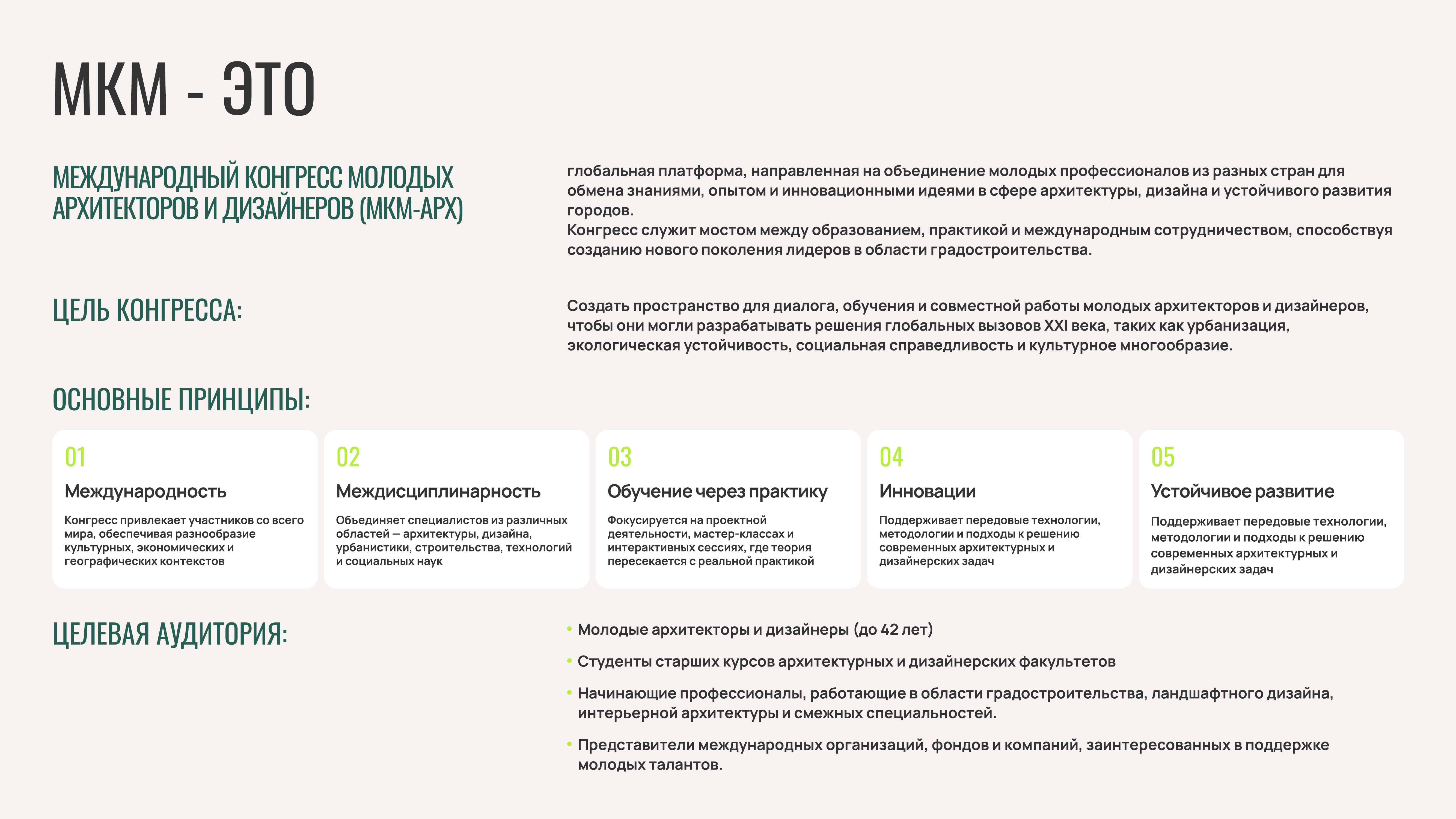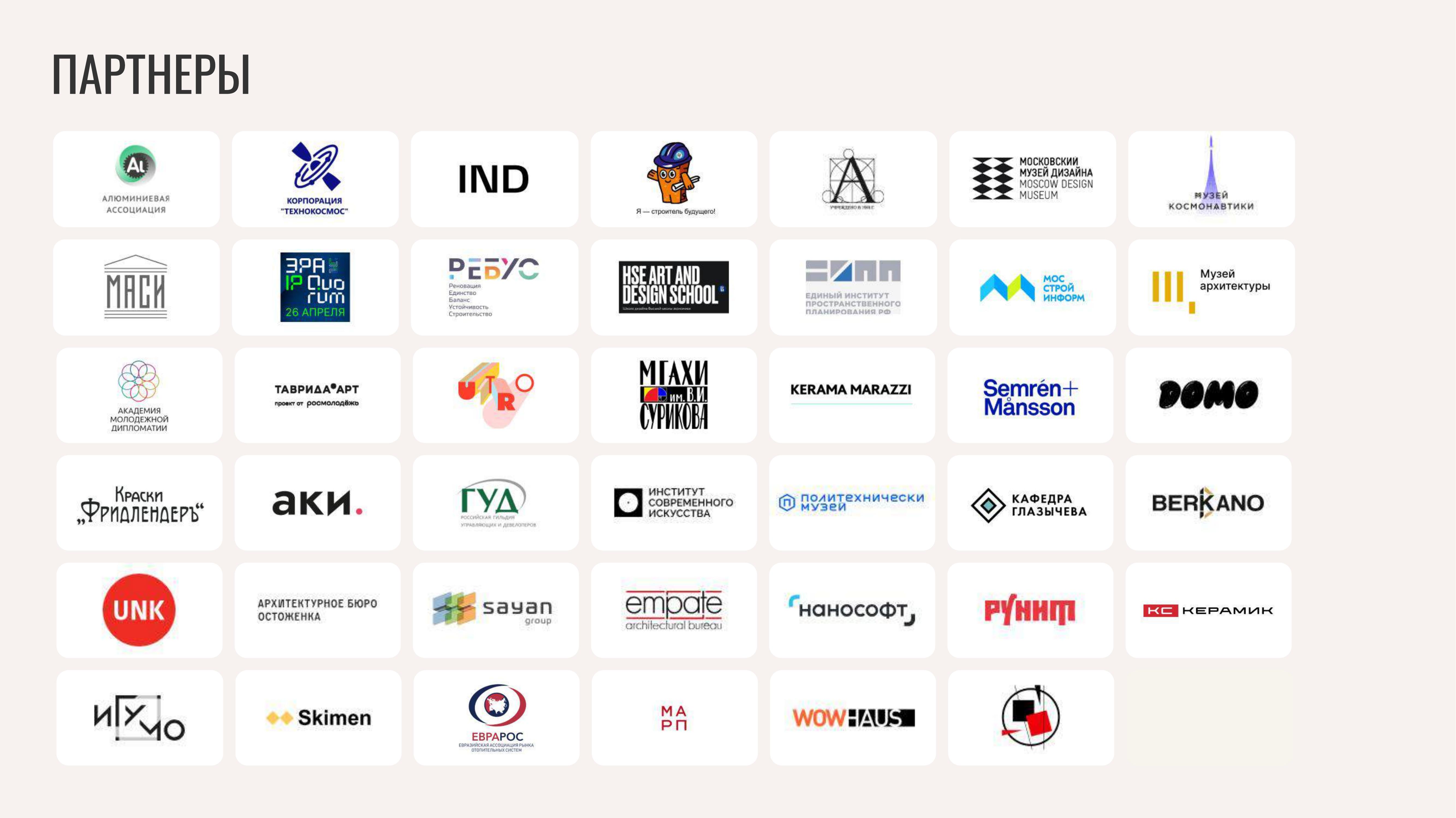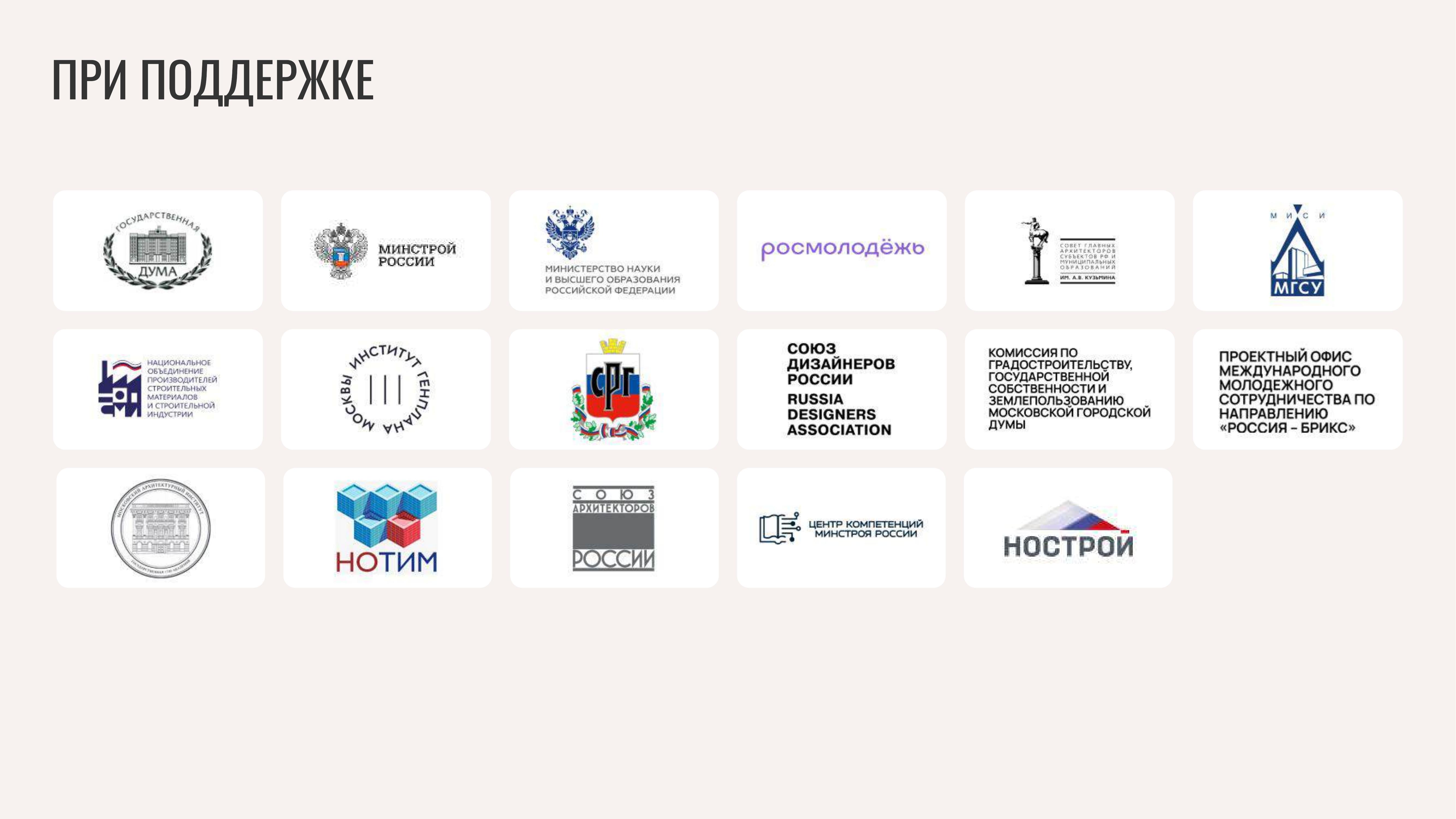 МКМ-АРХ – это международная платформа для укрепления научно-образовательных связей и практической подготовки нового поколения архитекторов и дизайнеров России. Традиционная поддержка федеральных министерств, таких как Государственная дума РФ, МИД РФ, Министерство образования и науки РФ, Министерства строительства и жилищно-коммунального хозяйства РФ, а также Росмолодежи подтверждает значимость наших инициатив. Нашими партнерами также выступают ведущие профильные ассоциации и деловые союзы страны.