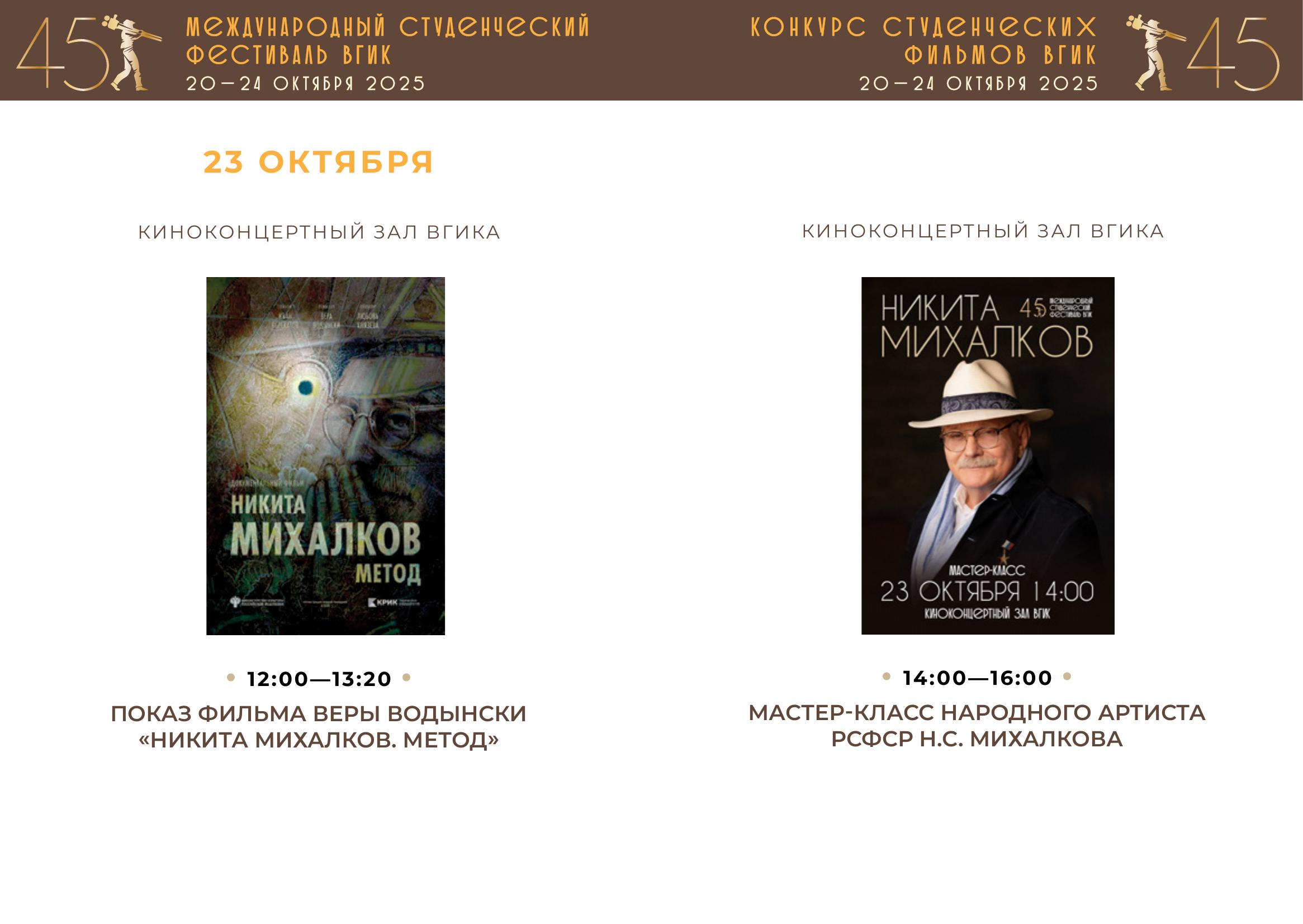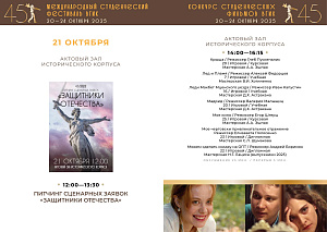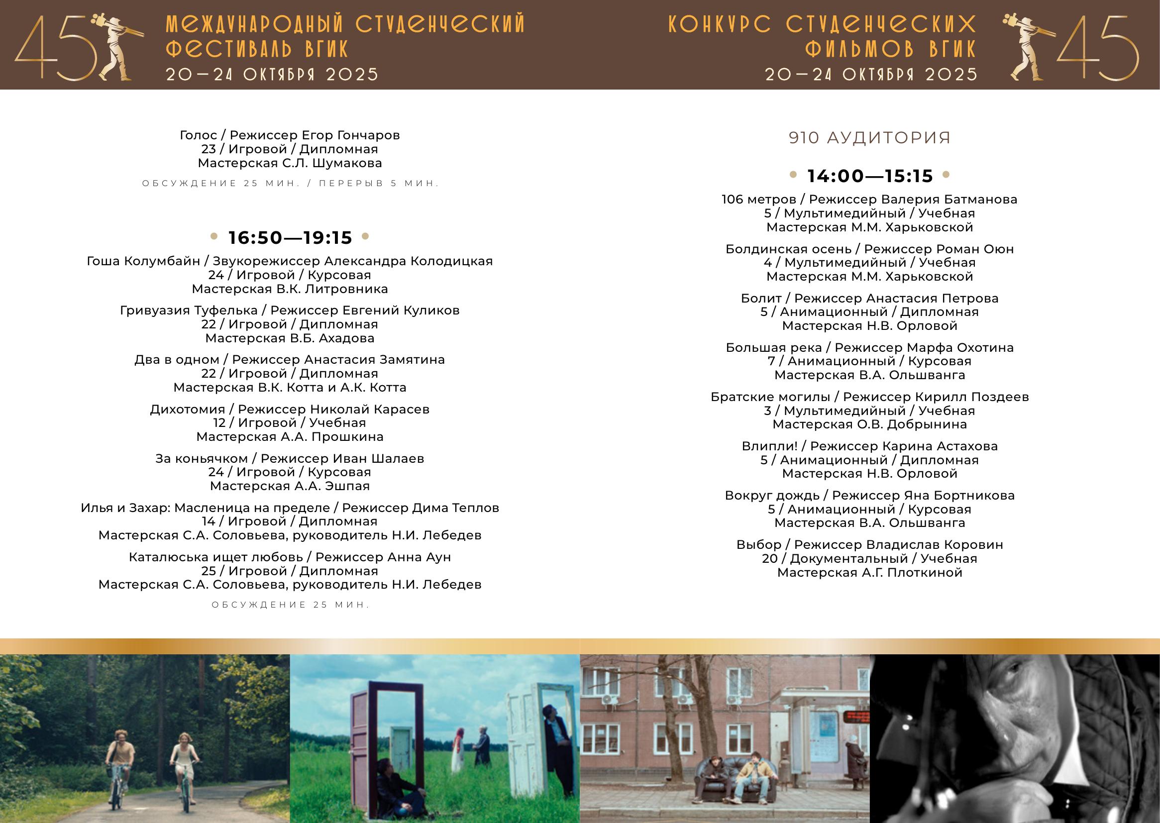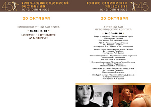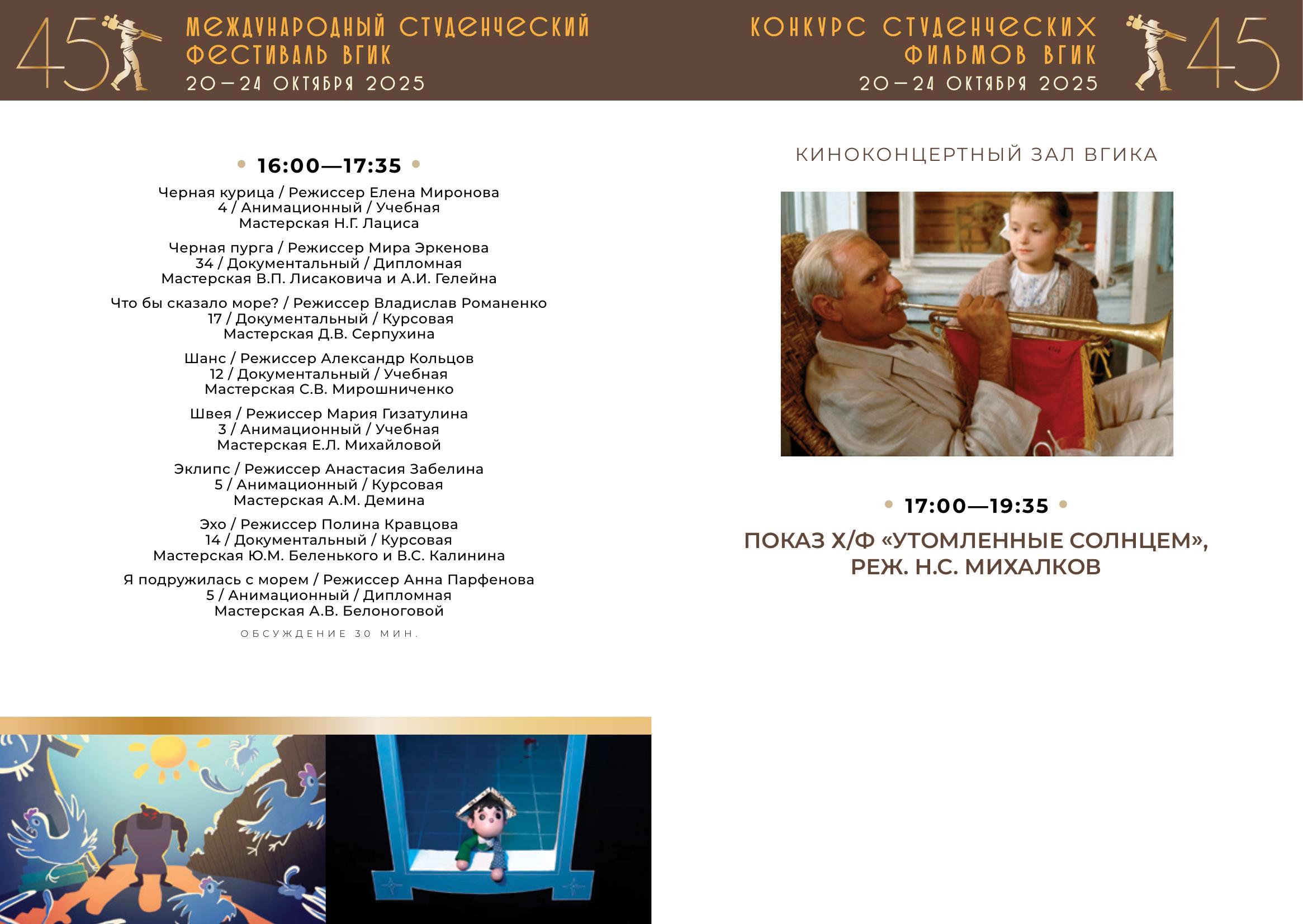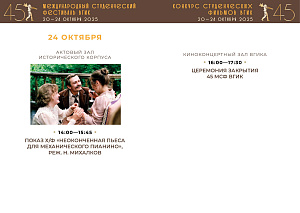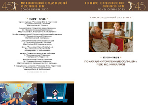 С 20 по 24 октября пройдет первый российский этап конкурса – Конкурс студенческих фильмов ВГИК. Жюри отберет лучшие фильмы, авторы которых продолжат участие во втором международном этапе фестиваля. За этот период будет показано 102 фильма участников-студентов ВГИКа и три картины Никиты Михалкова в качестве внеконкурсной программы. Призовые номинации первого этапа – 26.