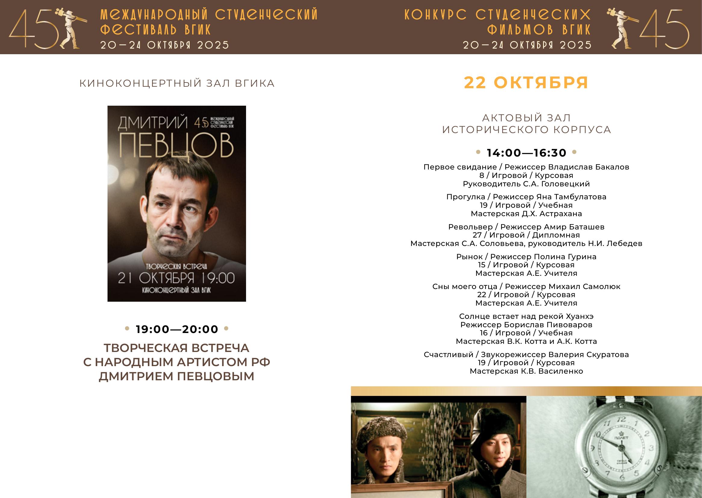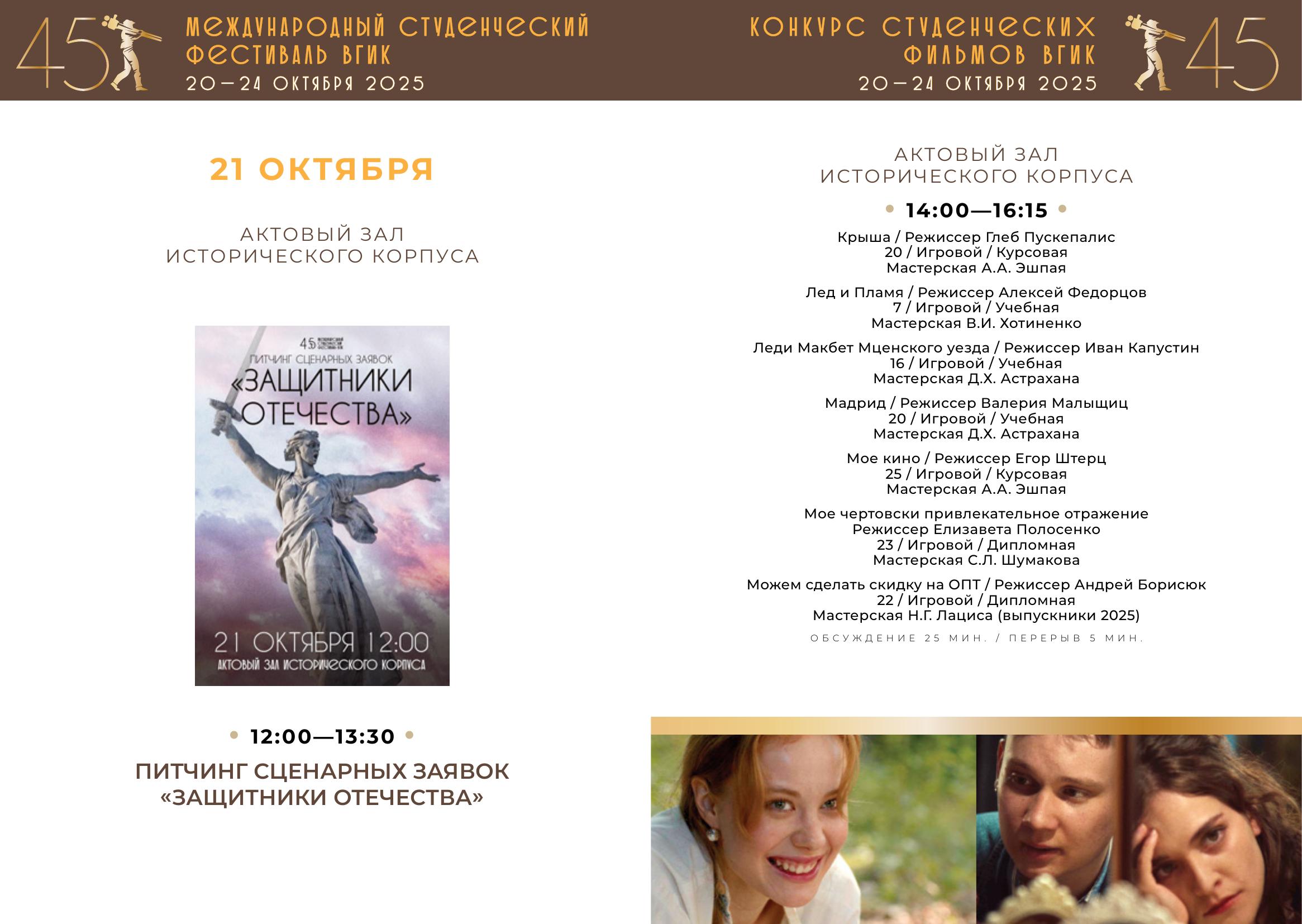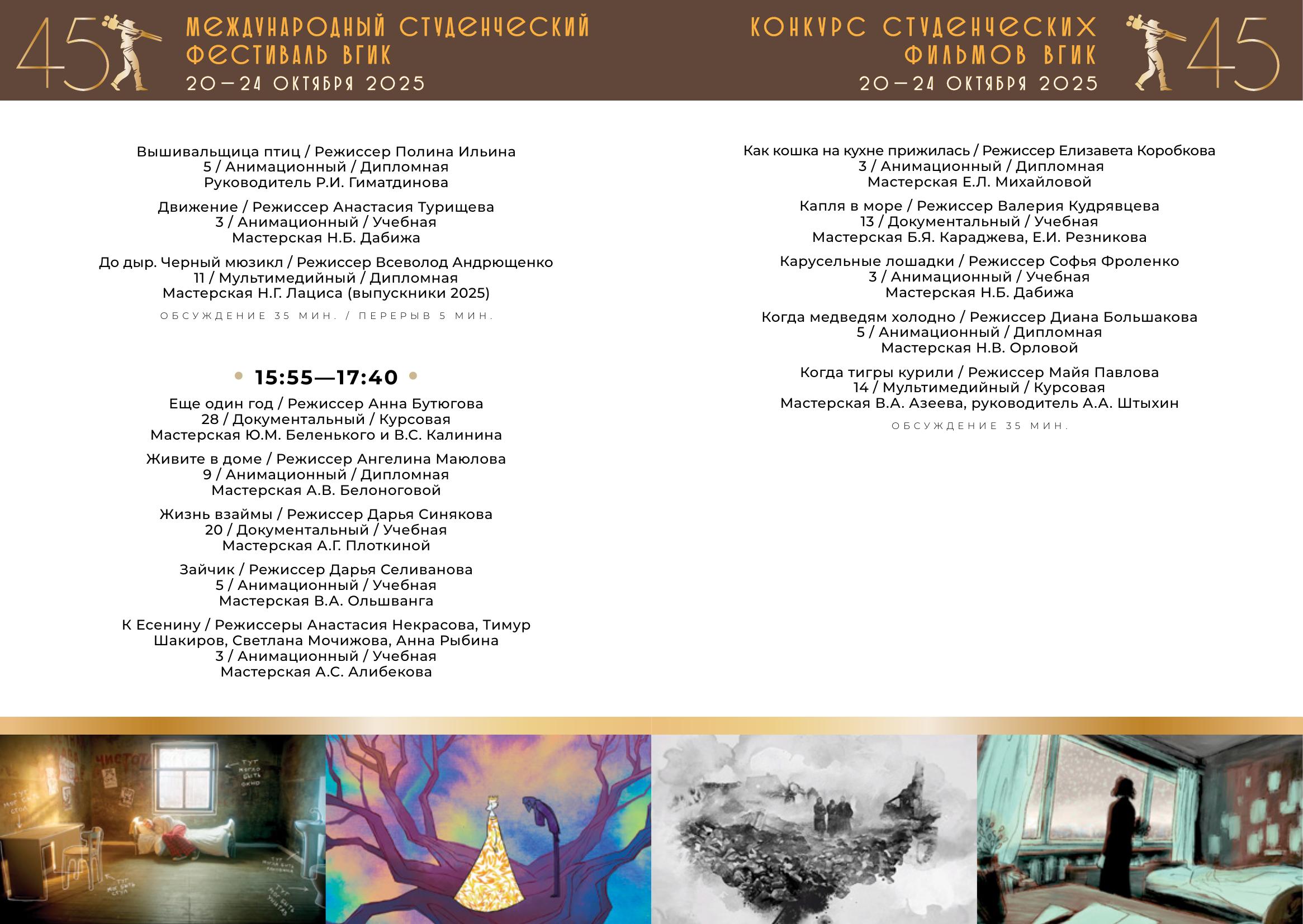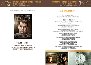 С 20 по 24 октября пройдет первый российский этап конкурса – Конкурс студенческих фильмов ВГИК. Жюри отберет лучшие фильмы, авторы которых продолжат участие во втором международном этапе фестиваля. За этот период будет показано 102 фильма участников-студентов ВГИКа и три картины Никиты Михалкова в качестве внеконкурсной программы. Призовые номинации первого этапа – 26.