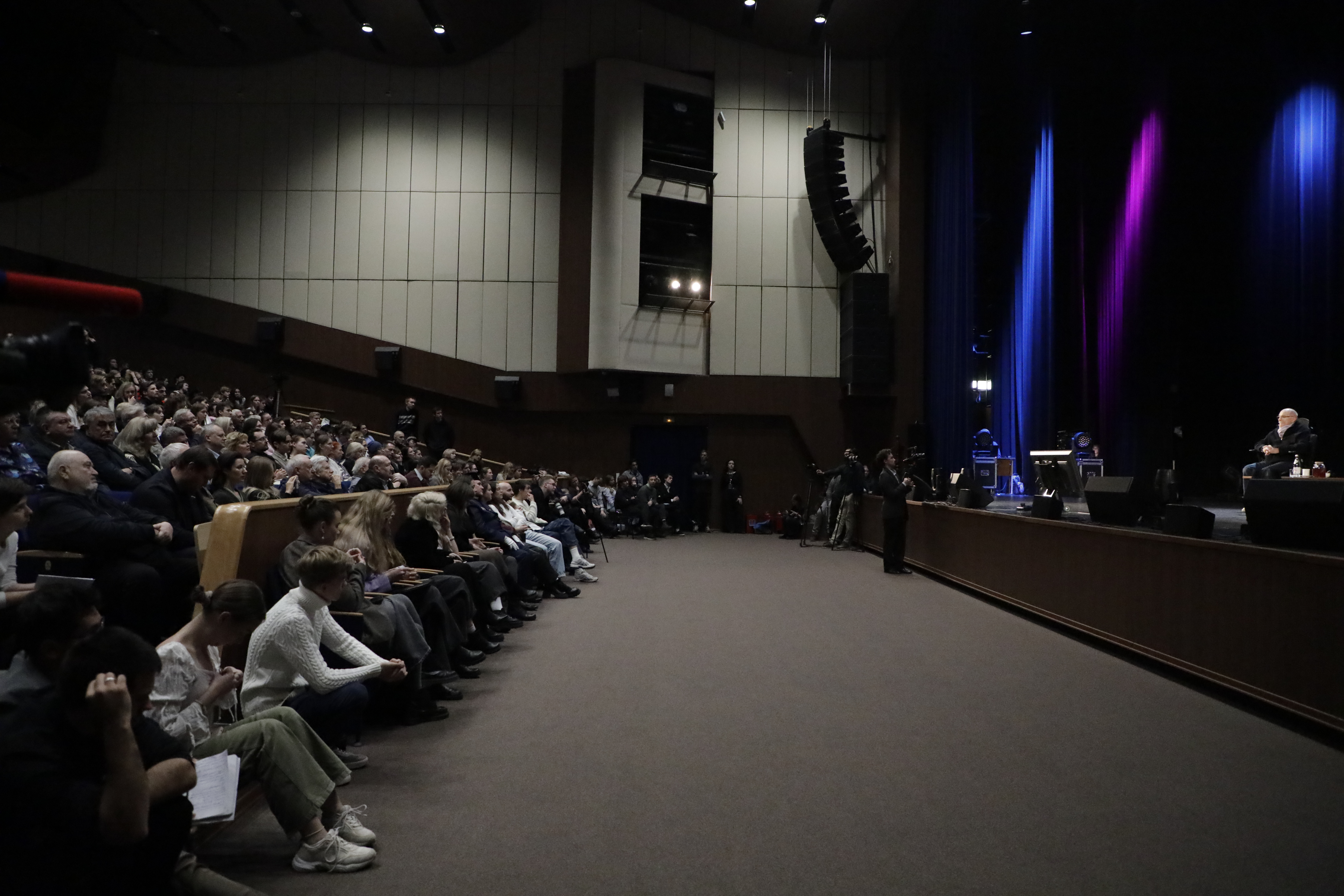 Никита Сергеевич вышел на сцену без пафоса — спокойно, по-домашнему. «Давайте сначала поговорим, а потом уж решите, как ко мне относиться», — сказал он, улыбнувшись. С первых минут режиссёр заговорил о сути актёрской профессии. Он рассказал, как важна для актёра концентрация, энергия и атмосфера — три столпа, на которых держится всё искусство.