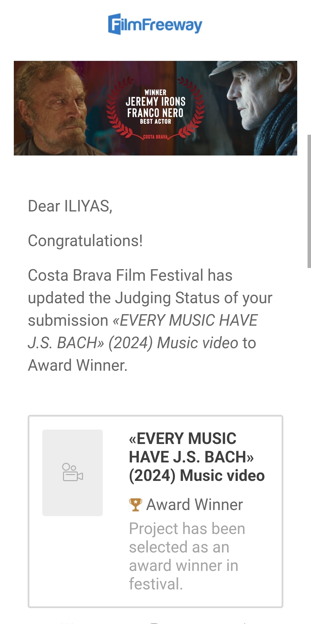Вчера стало известно, что данный проект ВГИК им. С.А. Герасимова вышел в Финал «Costa Brava Film Festival» и удостоен Приза NOMINEE. В Финале «Costa Brava Film Festival» 2025 Авторитетное Жюри назвало Танцевальный видео-проект «В Каждой Музыке И.С. Бах» Победителем номинации «ТАНЕЦ».