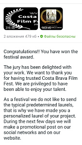 Из Поздравительного письма организаторов «Costa Brava Film Festival» в адрес студентов ВГИК им. С.А. Герасимова (перевод с английского). Поздравляем! Вы получили награду фестиваля. Жюри было в восторге от вашей работы. Мы хотим поблагодарить вас за доверие к «Costa Brava Film Festival». Для нас большая честь насладиться вашим талантом. Мы рады вашему участию и надеемся увидеть вас в дальнейшем в наших конкурсах. В течение следующих нескольких дней мы опубликуем рекламный пост в наших социальных сетях и на нашем веб-сайте. Большое вам спасибо и наши поздравления/ Анна, директор «Costa Brava Film Festival.