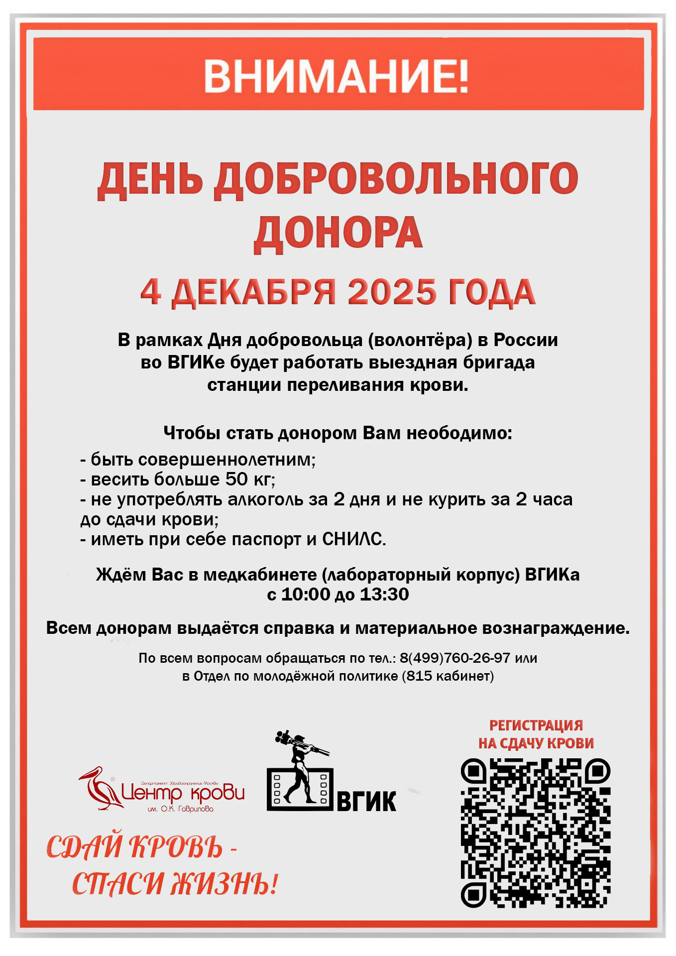 В рамках Дня добровольца (волонтёра) в России 4 декабря 2025 года во ВГИКе пройдёт День добровольного донора. Забор крови проведёт выездная бригада ГБУЗ «Центр крови имени О.К. Гаврилова ДЗМ».
