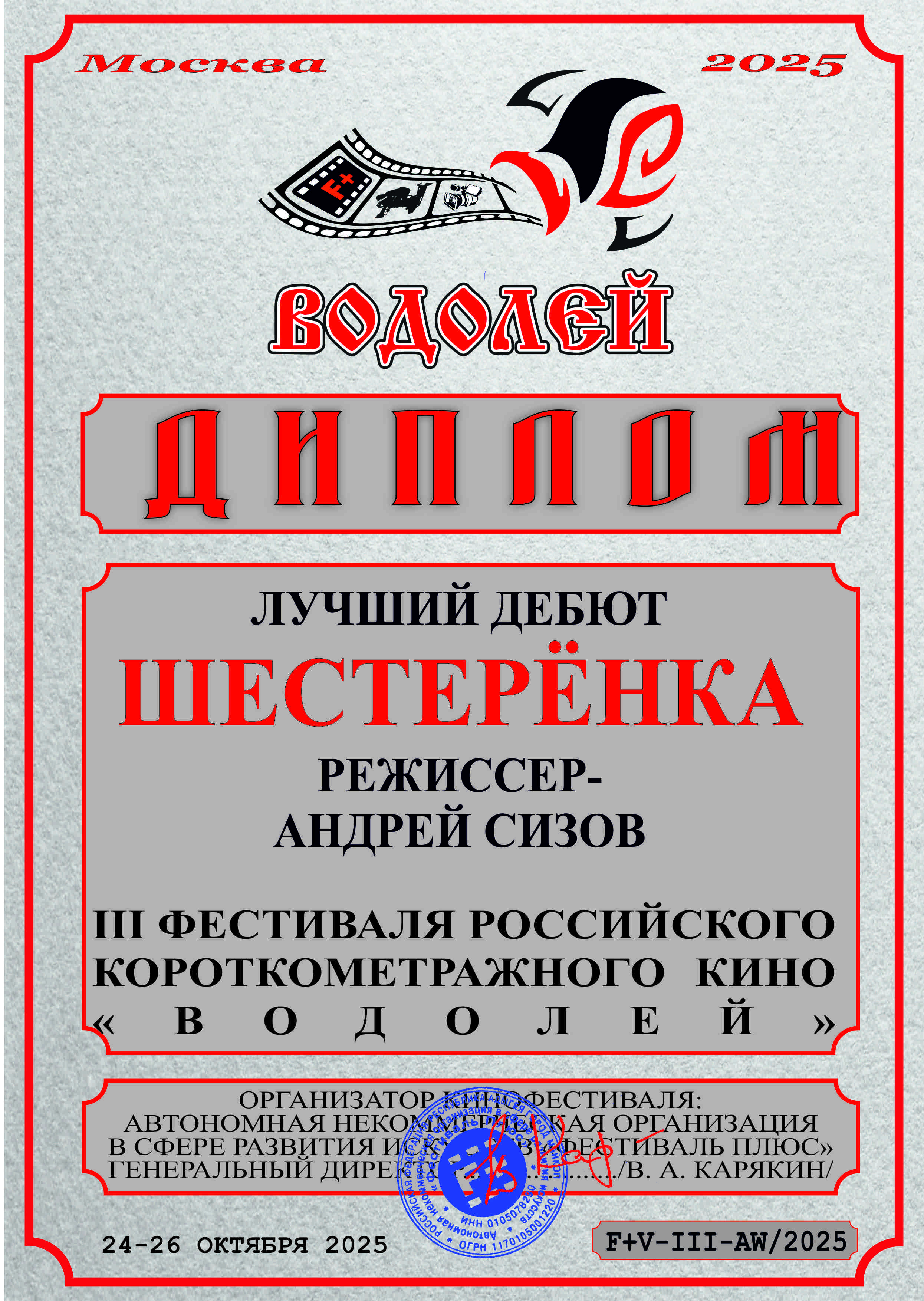 Попадание в финал и шорт-листы: XVIII Международный кинофестиваль актёров-режиссёров «Золотой феникс» (Смоленск); Донецкий Международный кинофестиваль; Mosfestfilm (Москва); Кинофестиваль «Мосты» (Санкт-Петербург); Майкопский Международный фильм-фестиваль; Феодосийский кинофестиваль; Первый кинофестиваль короткометражного кино «Проба» (Москва).