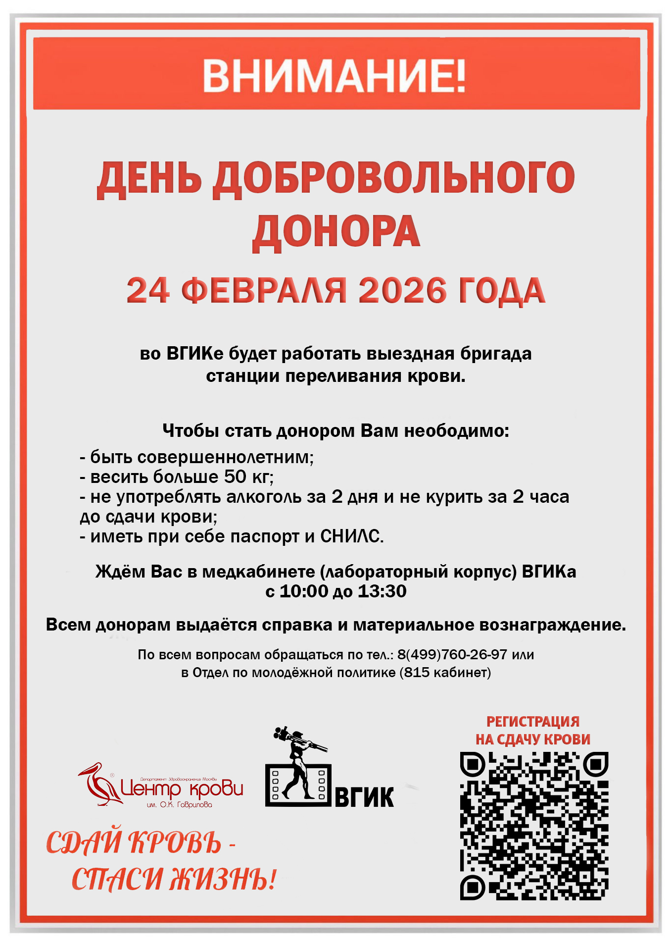 24 февраля 2026 года во ВГИКе пройдёт День добровольного донора. Забор крови проведёт выездная бригада ГБУЗ «Центр крови имени О.К. Гаврилова ДЗМ».