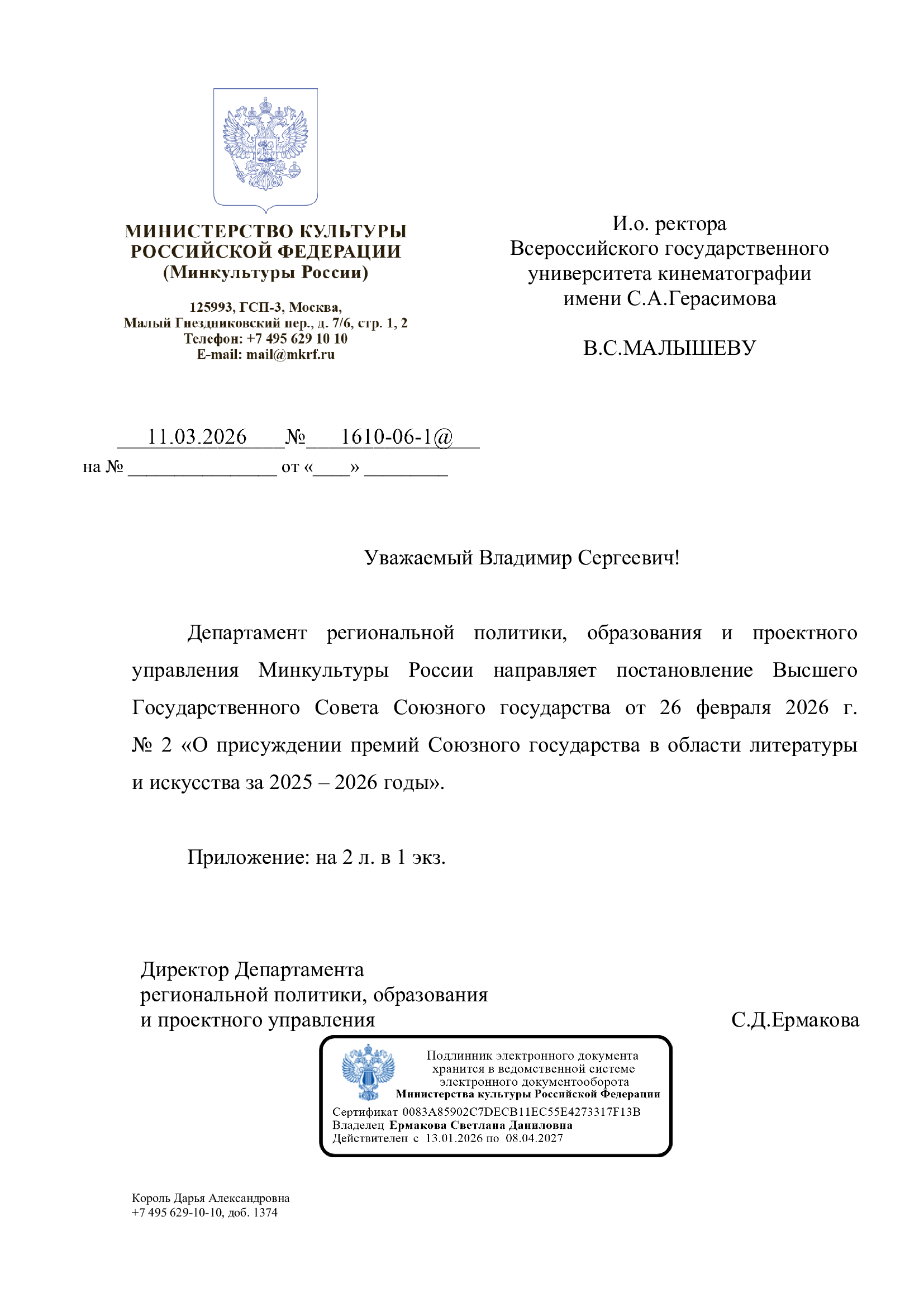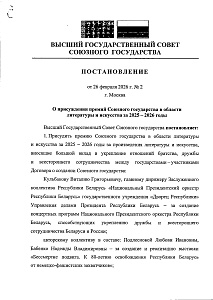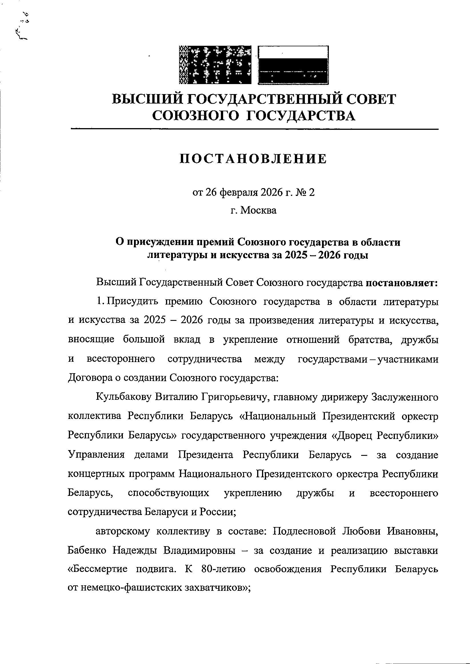 Департамент региональной политики, образования и проектного управления Минкультуры России направляет постановление Высшего Государственного Совета Союзного государства от 26 февраля 2026 г. № 2 «О присуждении премий Союзного государства в области литературы и искусства за 2025 – 2026 годы».