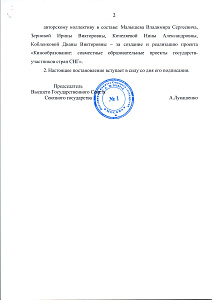Высший Государственный Совет Союзного государства постановляет: Присудить премию Союзного государства в области литературы и искусства за 2025 - 2026 годы за произведения литературы и искусства, вносящие большой вклад в укрепление отношений братства, дружбы и всестороннего сотрудничества между государствами - участниками Договора о создании Союзного государства: авторскому коллективу в составе: Малышева Владимира Сергеевича, Зерновой Ирины Викторовны, Кочеляевой Нины Александровны, Кобленковой Дианы Викторовны — за создание и реализацию проекта «Кинообразование: совместные образовательные проекты государств- участников стран СНГ».